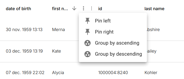 Grouping is applied per column via the column menu.