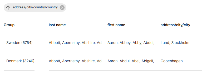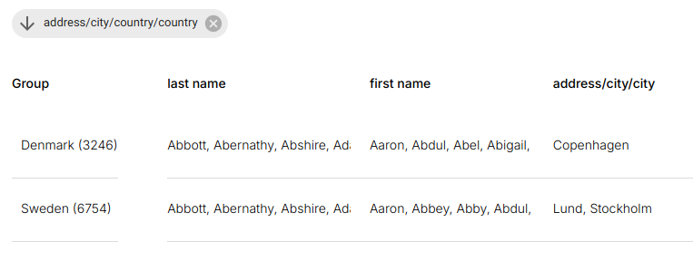 - Active groupings appear as tags above the table