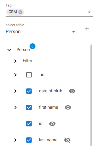 In large schemas, the table list can be filtered by tags to limit the search domain (e.g. "CRM", "Finance", "Operations").