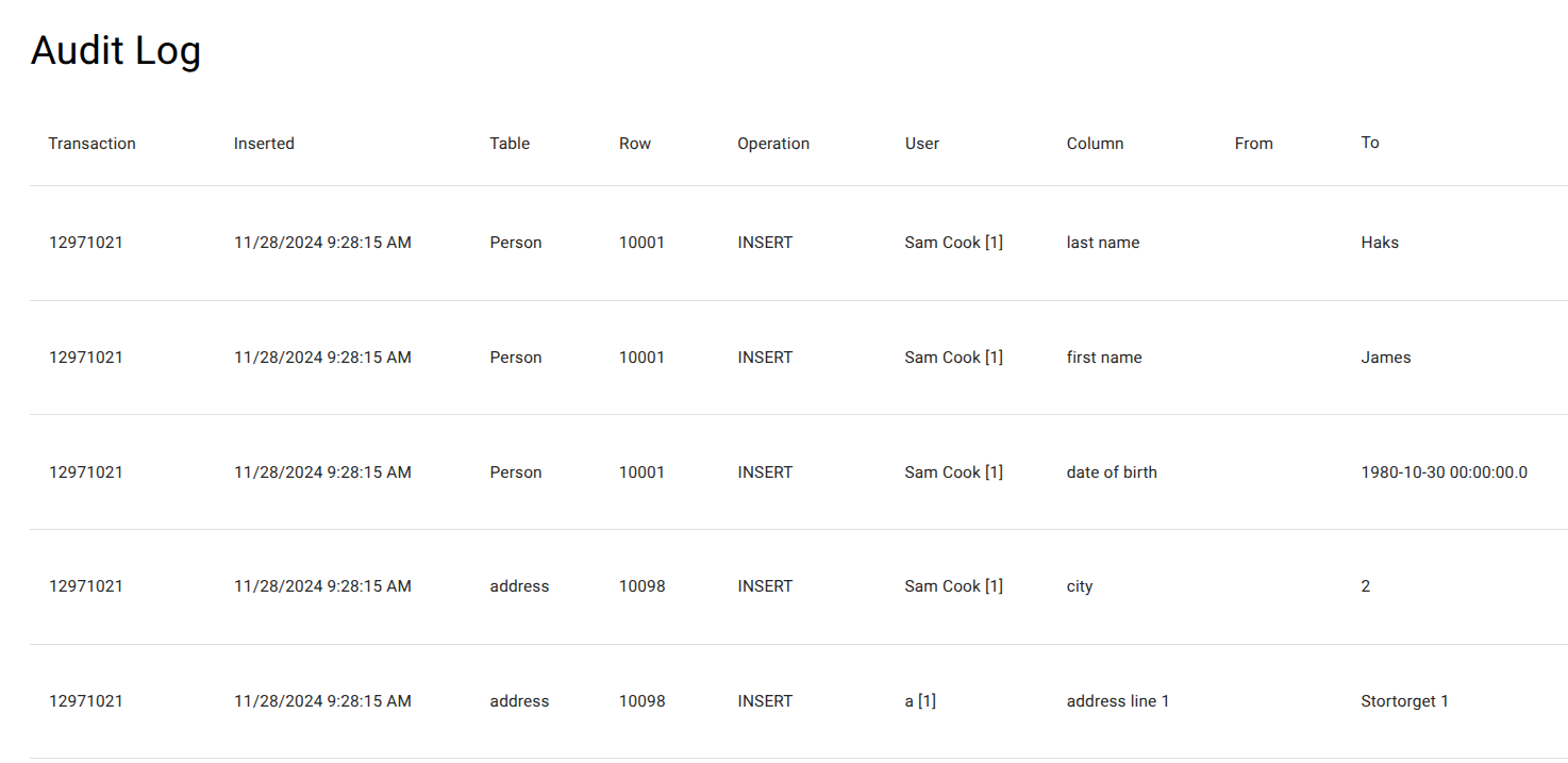 - Viewing the audit log for any participating table shows the full transactional context