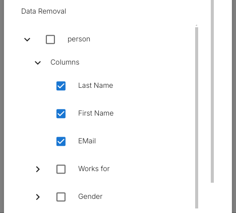 In the Data Removal section, each selected table and column is configured in one of two modes: