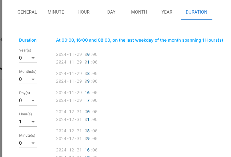 The configuration is done through an intuitive graphical interface without requiring knowledge of scheduling expressions. Users define repetition using five tabs—Minute, Hour, Day, Month, and Year—to construct precise recurrence rules. Only one selection per tab can be active at a time.