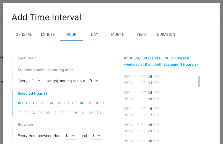 - Every Hour: Repeats at the start of each hour.
