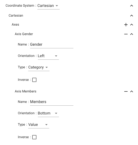 Example: A Cartesian configuration may render monthly sales as bars while overlaying a cumulative trend as a line series, both bound to the same x- and y-axes.