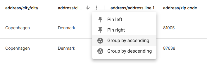 Grouping is applied per column via the column menu.