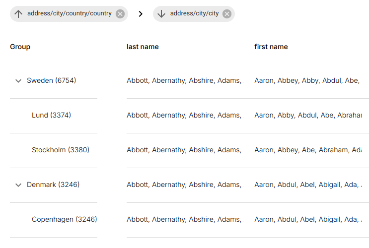 - Active groupings appear as tags above the table