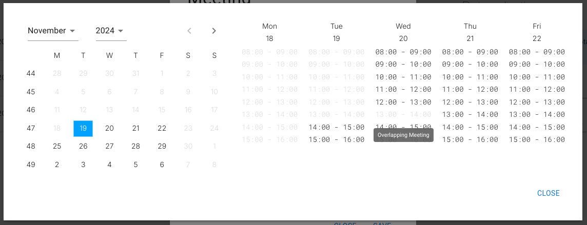 For example, a rule may prevent overlapping bookings. In the UI below, the slot from 12:00–13:00 is missing because it overlaps an existing booking: